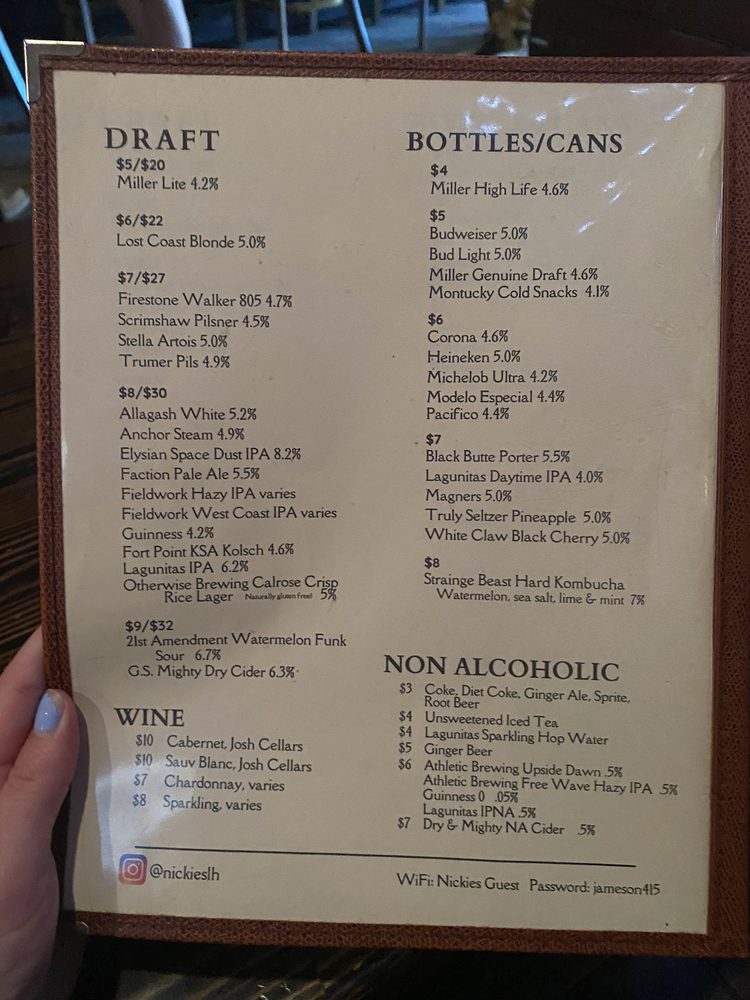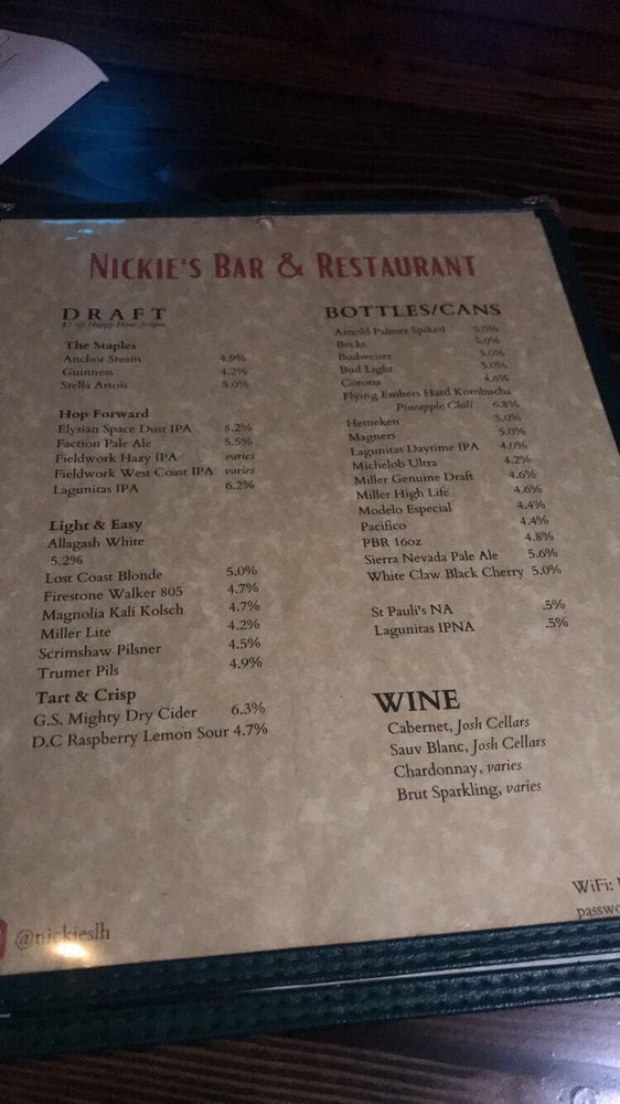 Nickies is an American restaurant located at 466 Haight St in San Francisco, CA. This casual spot offers a range of amenities such as takeout, reservations, delivery, and even catering services. Known for their fried chicken sandwich, Nickies also has a full bar serving up happy hour specials. With a welcoming atmosphere perfect for groups, Nickies also features outdoor seating, pool tables, and even a drive-thru. Customers rave about the friendly staff and delicious food, making it a must-visit spot in the area. Don't miss out on their Millertime Trivia nights on Tuesdays for a fun and entertaining experience.